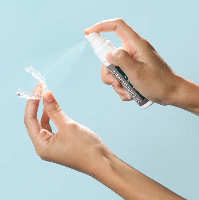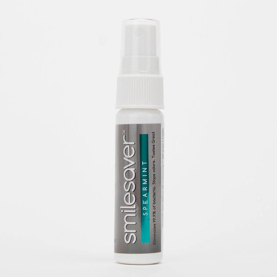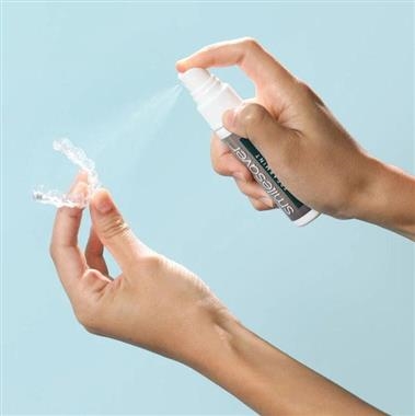 Smilesaver® is a cleansing and freshening spray for all removable oral devices, including orthodontic aligners. It helps improve patient experience and oral health while contributing to better treatment outcomes. Smilesaver helps eliminate bacteria from oral appliances and prevents buildup of biofilm that reduces unpleasant taste and odors. It also helps prevent harm to tooth enamel and gums from devices that encapsulate the dentition and are worn for extended period of times.
