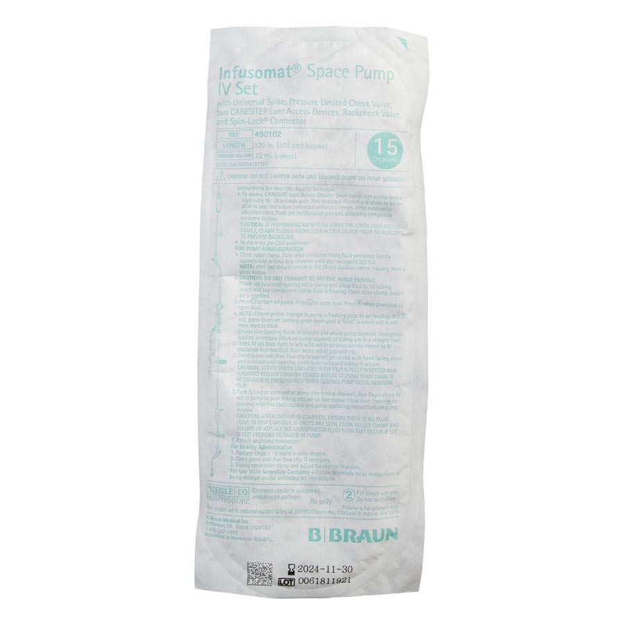 IV Pump Set Infusomat Space Pump 2 Ports 15 Drops/mL Drip Rate W/O Filter 120" Tubing Solution 49010