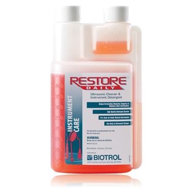 Restore™ Daily is a concentrated liquid detergent for use in ultrasonic machines or undiluted as a pre-soak for badly stained stainless-steel instruments. Restore™ Daily is designed to clean stainless steel dental instruments and laboratory glassware.